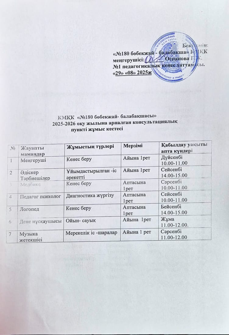 2025-2026 оқу жылына консультациялық пункттің жұмыс жоспары » ГККП "Ясли сад №180"
